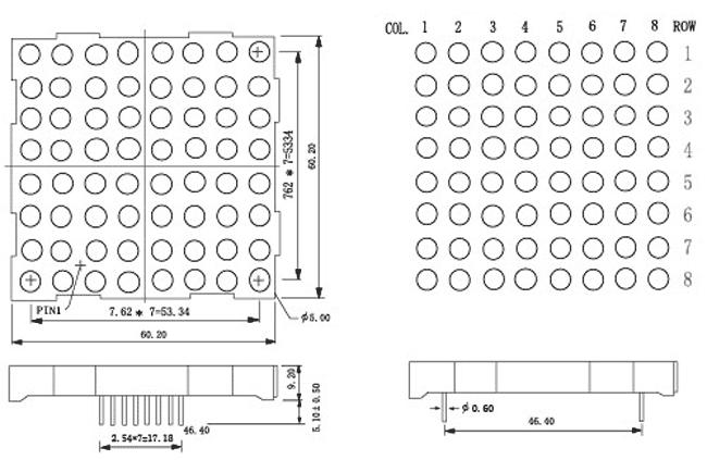 5mm 8x8 Dot matrix LED display, RED color, 60.2 x 60.2mm