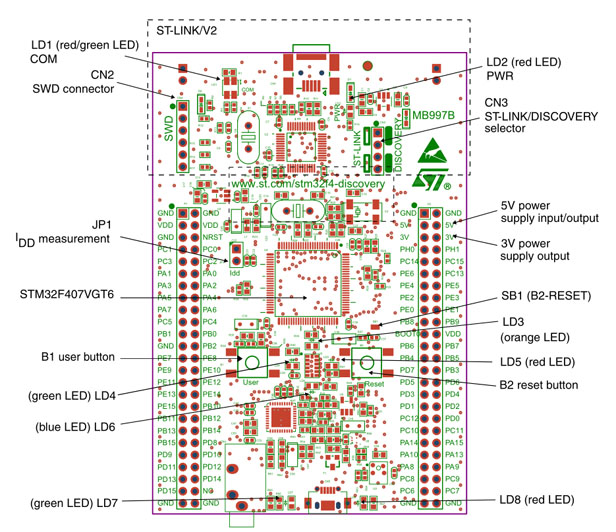 Based on the STM32F407VGT6, it includes an ST-LINK/V2 embedded debug tool, two ST MEMS, digital accelerometer and digital microphone, one audio DAC with integrated class D speaker driver, LEDs and push buttons and an USB OTG micro-AB connector.