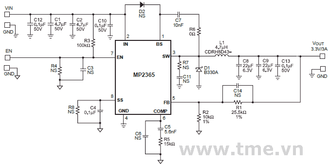 MP2365 tích hợp một các MOSFET 120mΩ cung cấp dòng tải liên tục đến 3A, với một phạm vi điện áp ngõ vào rộng từ 4.75V đến 28V.