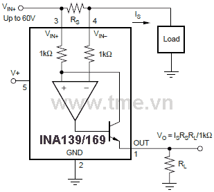 Input common-mode and power-supply voltages are independent and can range from 2.7V to 40V for the INA139 and 2.7V to 60V for the INA169. Quiescent current is only 60µA, which permits connecting the power supply to either side of the current measurement shunt with minimal error.