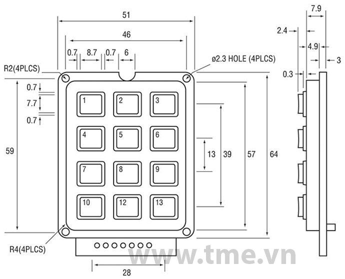 Keypad 3x4 Matrix, Plastic, Size 51 x 64 mm