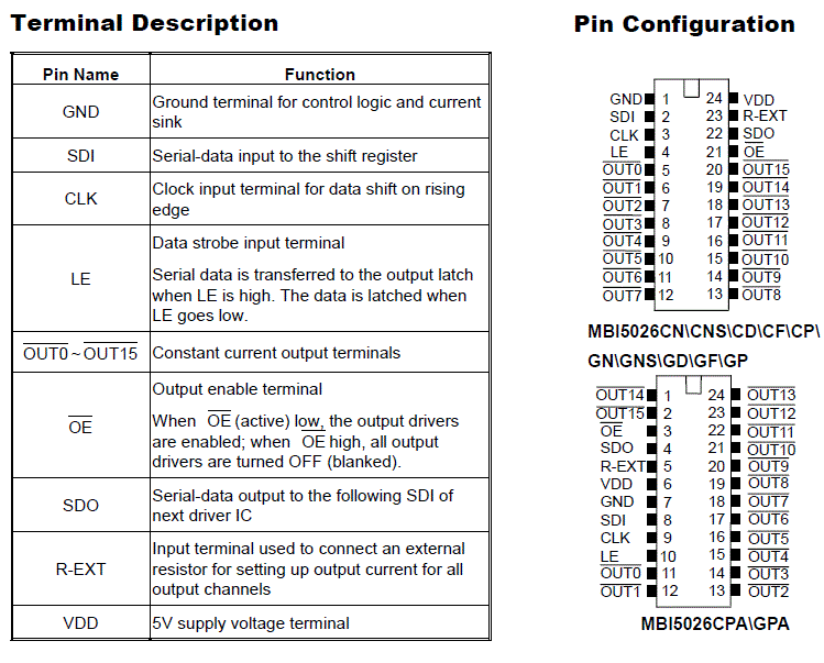 MBI5026 provides users with great flexibility and device performance while using MBI5026 in their system design for LED display applications, e.g. LED panels. Users may adjust the output current from 5 mA to 90 mA through an external resistor, Rext, which gives users flexibility in controlling the light intensity of LEDs. MBI5026 guarantees to endure maximum 17V at the output port. The high clock frequency, 25 MHz, also satisfies the system requirements of high volume data transmission.
