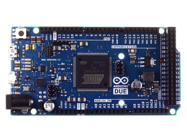 The Arduino Due is a microcontroller board based on the Atmel SAM3X8E ARM Cortex-M3 CPU (datasheet). It is the first Arduino board based on a 32-bit ARM core microcontroller. It has 54 digital input/output pins (of which 12 can be used as PWM outputs), 12 analog inputs, 4 UARTs (hardware serial ports), a 84 MHz clock, an USB OTG capable connection, 2 DAC (digital to analog), 2 TWI, a power jack, an SPI header, a JTAG header, a reset button and an erase button.