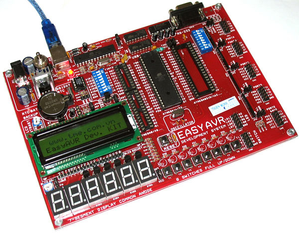 - USB On-board programmer chuyển mạch hoàn toàn tự động được hỗ trợ sẵn trong các trình biên dịch như AVR Studio, CodevisionAVR...