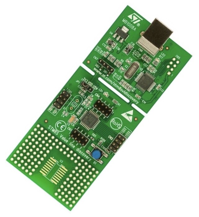 Even though the STM8SVLDISCOVERY is built around an STM8S003K3T6, it allows evaluation of the main features of all the STM8S Value line MCUs. It includes an ST-LINK embedded debug tool.