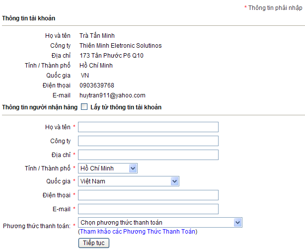 Sau đó nhấn "Tiếp tục", một đơn hàng tương đối hoàn chỉnh bao gồm cả cước vận chuyển và tổng cộng cùng với các thông tin đầy đủ về người mua hàng và người nhận hàng [ Xem hình 3-3]