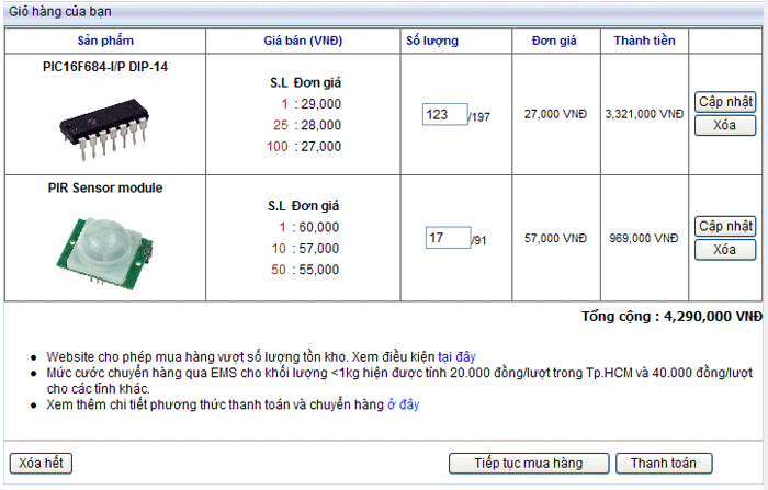 • Mỗi mục hàng hóa đều có nút "cập nhật" và "xóa" cho phép bạn điều chỉnh số lượng hoặc xóa hẳn nó ra khỏi giỏ hàng