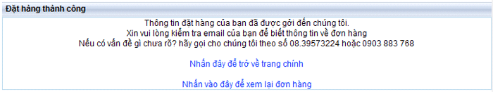Bạn có thể xem lại đơn hàng hoàn chính của mình, hoặc trở về trang chính. kết thúc quy trình mua hàng