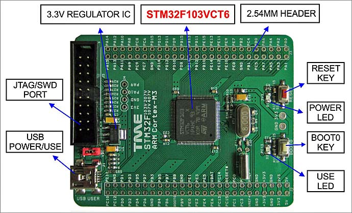 Header board sử dụng chip STM32F103VCT6 100-pin ARM Cortex-M3 Tất cả các GPIOs được đưa ra ngoài qua header 2.54mm.