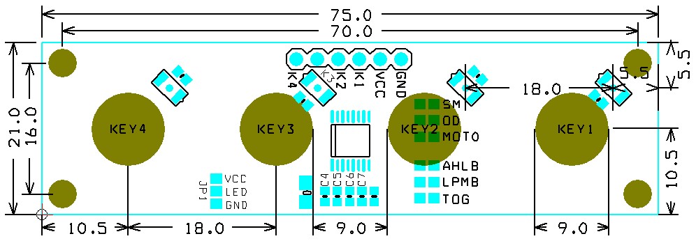 Mặt phím nhấn: TOUCH-CAP-4KEY không kèm theo mặt phím nhấn, khách hàng có thể sử dụng các vật liệu phi kim loại như mica, kính, nhựa, gỗ…với độ dày khoảng 2mm, nếu độ dày nhỏ hơn hoặc lớn hơn có thể điều chỉnh lại độ nhạy bằng điện dung C4, C5, C6, C7 cho phù hợp. Có thể nhấn trực tiếp mà không cần có mặt phím nhấn.